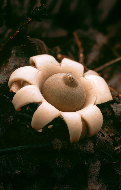 Its outer layer cracks open with mathematical precision, forming radial “arms” that curl back to reveal a perfectly spherical spore sac in the center. Tap it and it “puffs” like a miniature supernova.