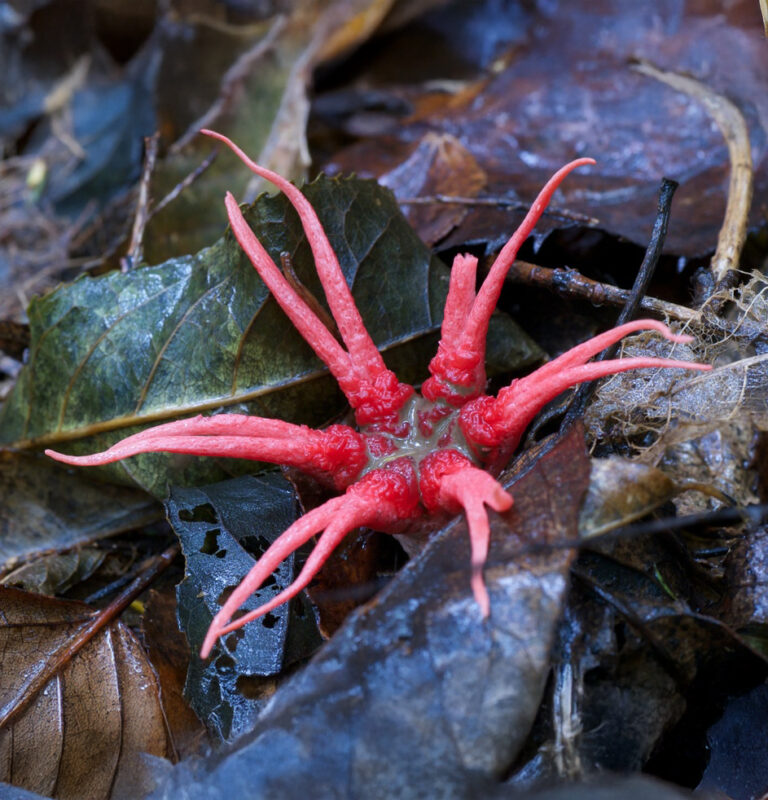 Aseroe rubra bursts from the soil as a red, star-shaped bloom of rubbery tentacles. Its arms are coated in a dark, sticky substance meant to attract flies — nature’s Uber drivers for spores.